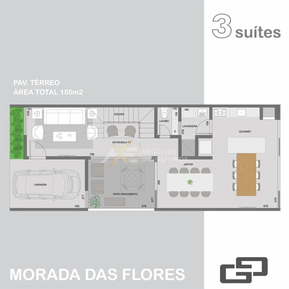 O imóvel possui Ampla sala de estar e jantar, Cozinha integrada à área gourmet, Sala de TV, 3 suítes, Home office, Lavabo, Lavanderia, Pátio descoberto, Garagem coberta para 1 carro e Infra para ar-condicionados.